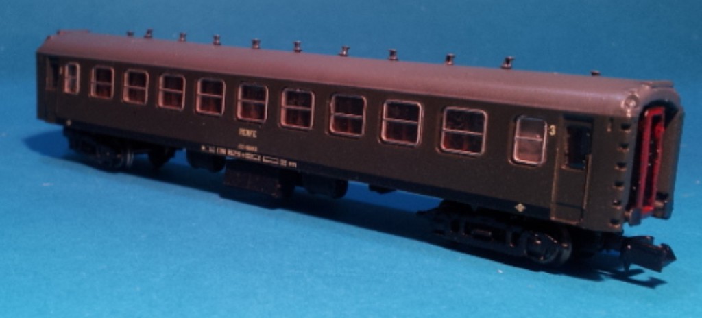 Reproducción del coche de pasajeros RENFE serie CC-5000 de 9 departamentos, en su versión original con fuelle de intercomunicación en ambos testeros.