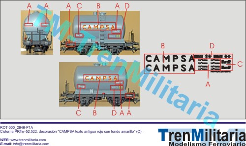 | Referencia O-RE-000_0005 Vagón mercancías RENFE Cisterna PRfhv-52.522 (O), en decoración CAMPSA texto antiguo rojo con fondo amarillo | 6,24 € |