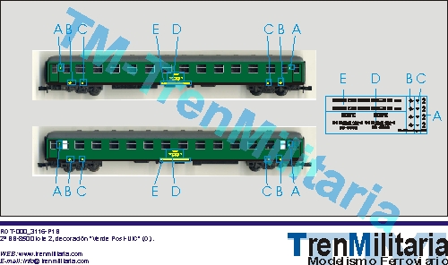 | Referencia O-RE-000_0011 Coche pasajeros RENFE 2ª BB-8592 lote 2 (vent. rectangulares) (O), en decoración Verde Post-UIC | 7,60 € |