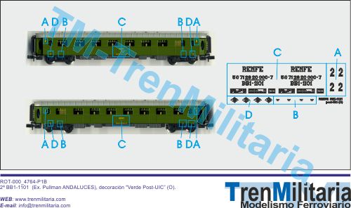 | Referencia O-RE-000_0032 Coche pasajeros RENFE 2ª BB1-1101 (Ex. Pullman ANDALUCES) (O), en decoración Verde Post-UIC | 7,60 € |