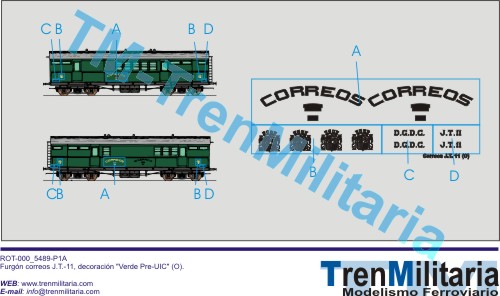| Referencia O-RE-000_0033 Vagón Furgón RENFE furgón correos J.T. 11 (O), en decoración Verde Pre-UIC | 4,42 € |