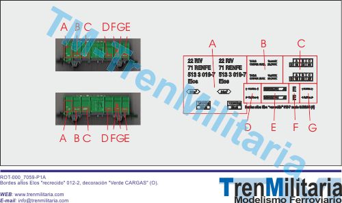 | Referencia O-RE-000_0028 Vagón mercancías RENFE Bordes altos Elos "recrecido" 019-7 (O), en decoración Verde CARGAS | 4,42 € |