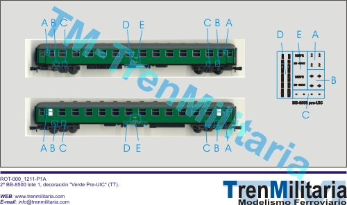 | Referencia TT-RE-000_0002 Coche pasajeros RENFE 2ª BB-8500 lote 1 (TT), en decoración Verde Pre-UIC | 4,42 € |