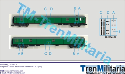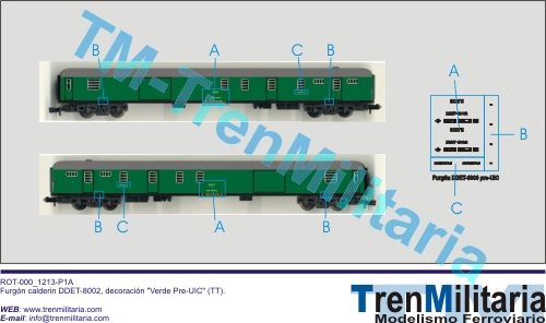 | Referencia TT-RE-000_0004 Vagón furgón RENFE furgón calderin DDET-8002 (TT), en decoración Verde Pre-UIC | 4,42 € |