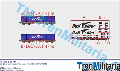 | Referencia TT-RE-000_0008 Vagón mercancías RAIL SIDER Bordes altos Ealos 038-2 XX (TT), en decoración azul | 4,87 € |